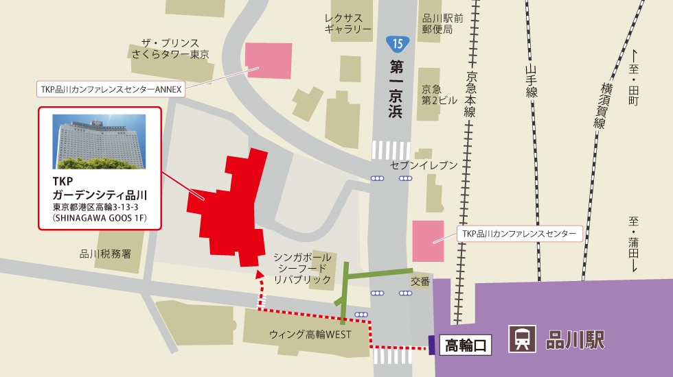会場のTKPガーデンシティ品川[品川GOOS]は、JR/京急線 品川駅(高輪口)が最寄り駅です。詳細は下記ページをご参照下さい。
